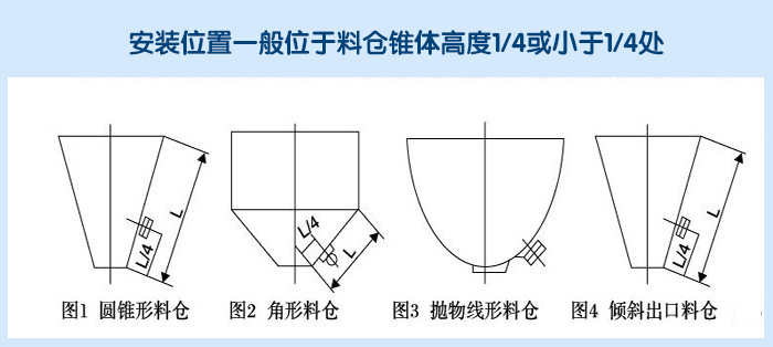 4、振動器安裝位置一般位于料倉錐體高度1/4或小于1/4處。