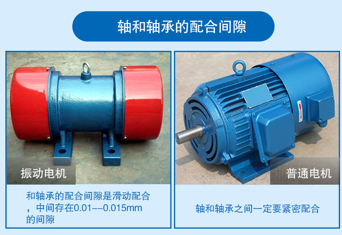 一、其實在振動電機的生產(chǎn)時,軸和軸承的配合間隙就和普通電機是不一樣的,普通電機的軸和軸承之間一定要緊密配合,而振動電機中軸和軸承的配合間隙是滑動配合,中間存在0.01--0.015mm的間隙,在維修時會感覺軸會產(chǎn)生左右串動。其實這個間隙配合是有著它的重要作用的。