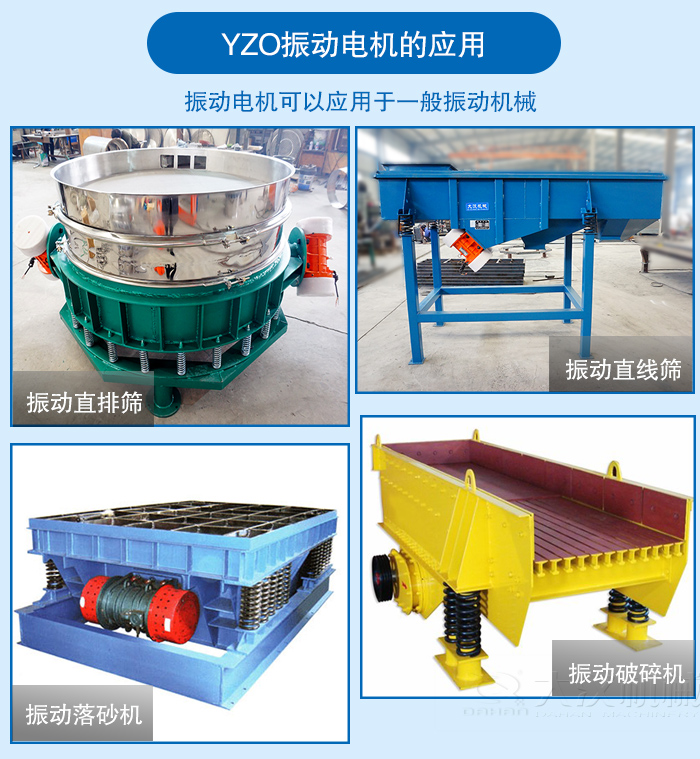 振動(dòng)電機(jī)可以應(yīng)用于一般振動(dòng)機(jī)械,如:振動(dòng)破碎機(jī)、振動(dòng)篩分機(jī)、振動(dòng)打包機(jī)、振動(dòng)落砂機(jī)、振動(dòng)造型機(jī)、振動(dòng)打樁機(jī)、振動(dòng)提升機(jī)、振動(dòng)充填機(jī)、料倉(cāng)的振動(dòng)破拱防閉塞裝置等等。